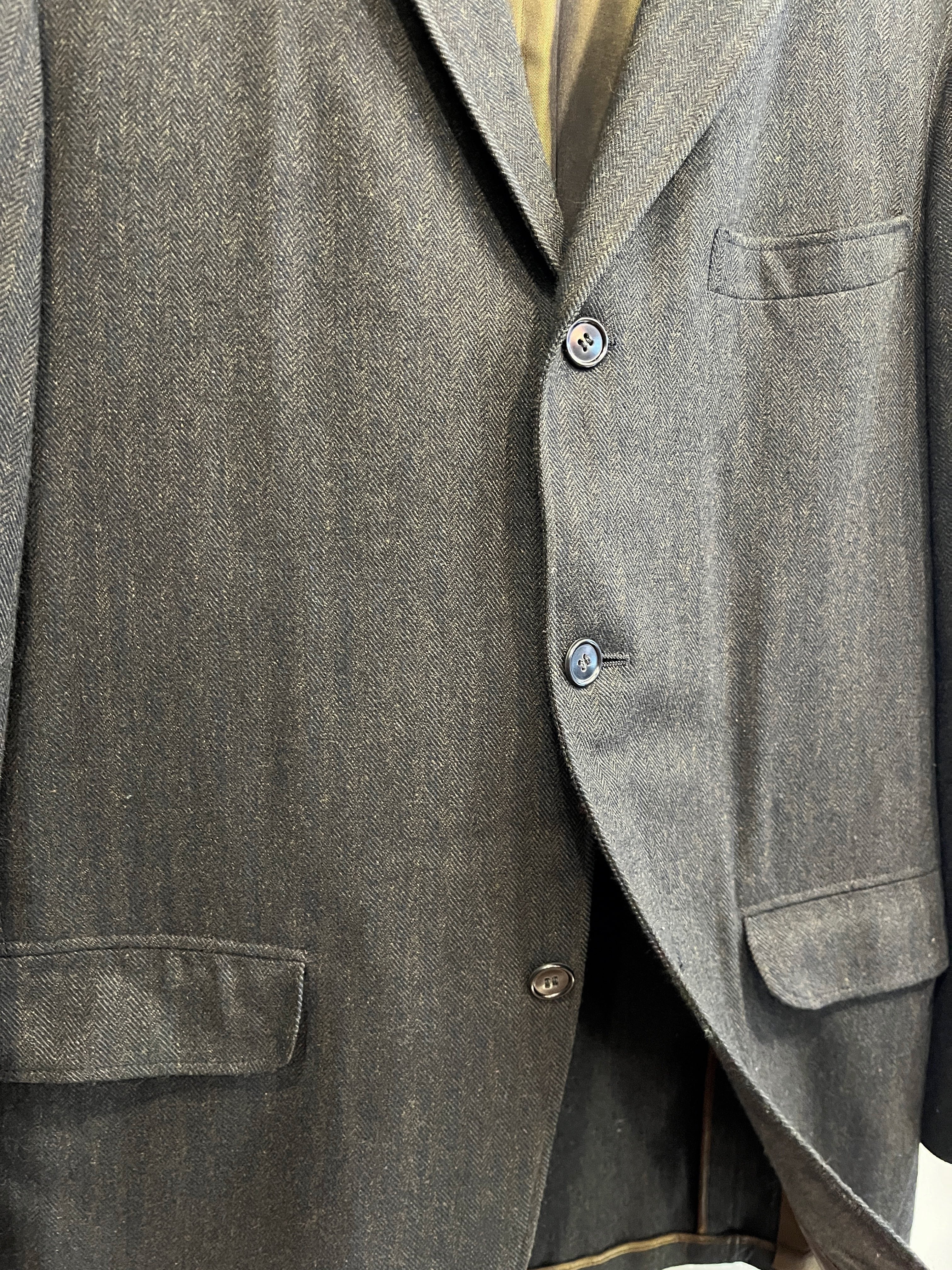上2つ掛けの3つボタン、ナチュラルショルダー、フックベントの入る